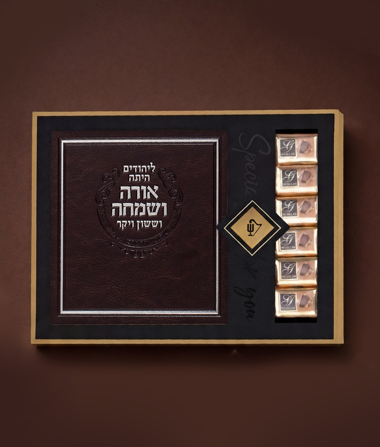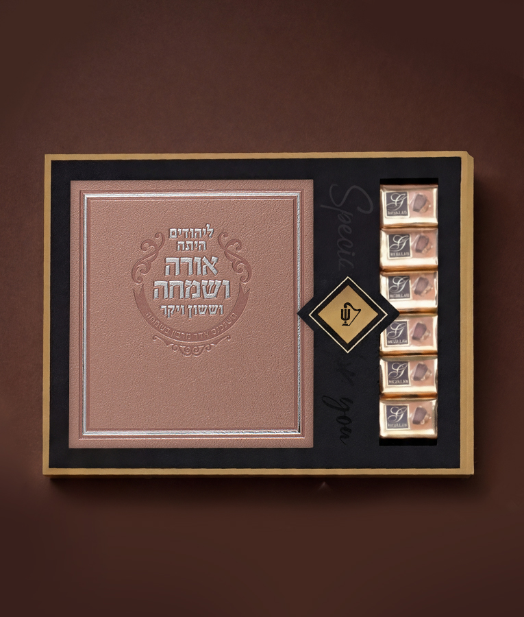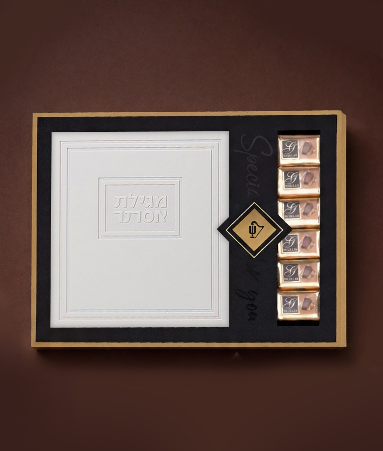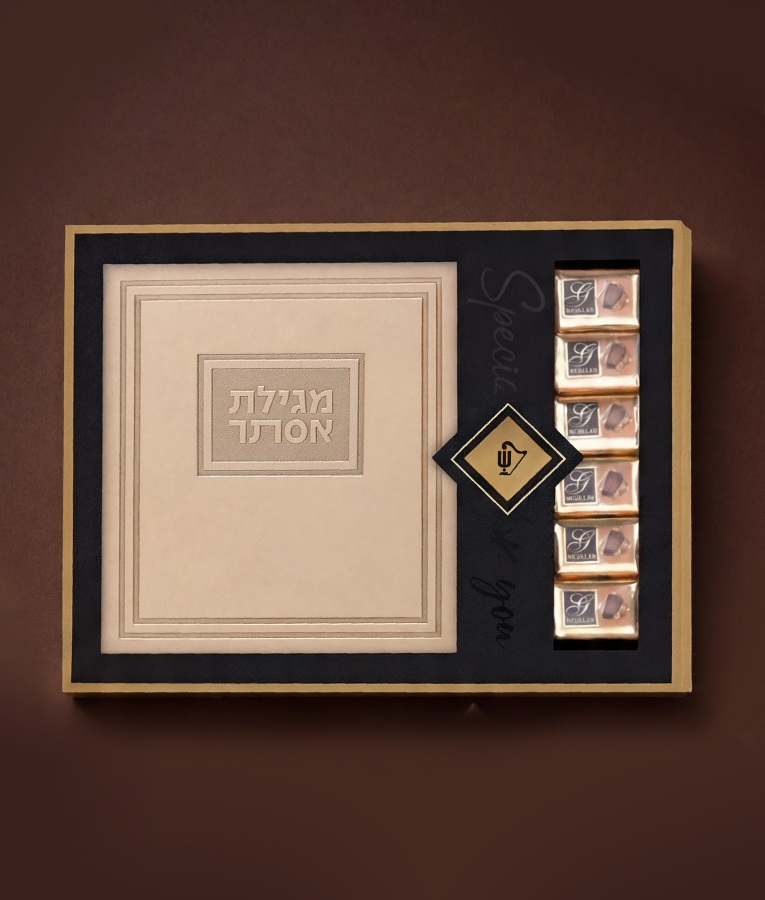 המארז מכיל מגילת אסתר מהודרת בכריכת דמוי עור מפוארת (לבחירתכם, 3 דגמים מתאימים)